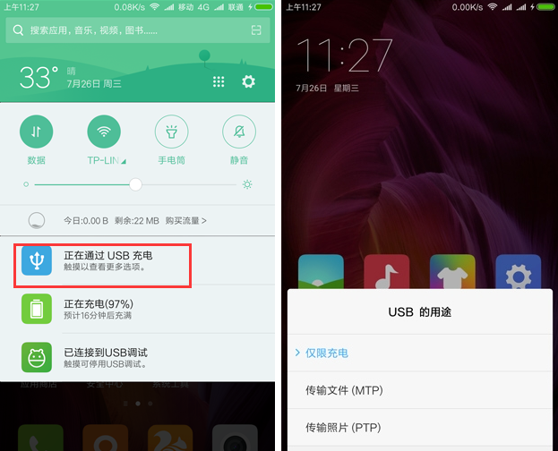 1、将手机连接电脑后会有提示,下拉状态栏点击【正在通过USB充电】,选择【传输文件MTP】就可以在电脑中管理手机文件了。