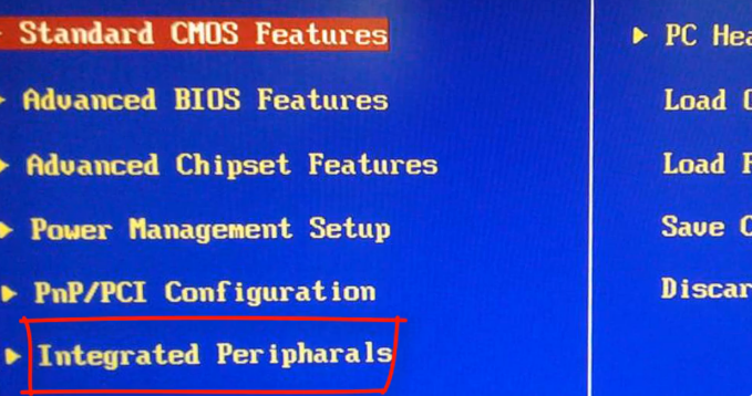 1、重启电脑,不停的敲击进入BIOS的启动热键,一般为F2、ESC、Del键,大家可以尝试一下。进入BIOS主界面,上下方向键选择integrated peripherals,回车。(不同的电脑BIOS界面不一,设置方法大体相同)