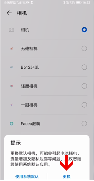 3、点击相机功能,选择需要手机内的美颜软件,再点击更换即可。