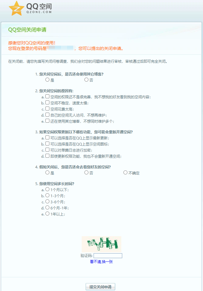 2、通过帐号密码登录注销页面后,请根据页面中的提示填问写卷调查、图形验证码,然后点击【提交关闭申请】按钮即可完成注销(关闭)操作。