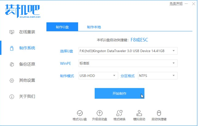 1、电脑打开浏览器搜素装机吧一键重装系统软件下载并打开。准备一个8GB以上的U盘。打开软件,选择制作系统,在制作U盘中选择您的U盘,其它参数默认直接开始制作即可。