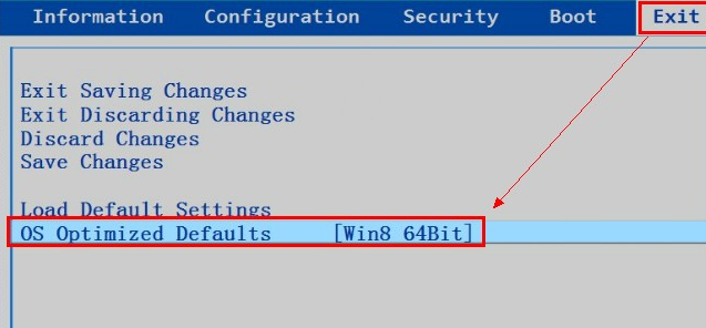 进入bios设置界面后,接着切换到 Exit 栏目,然后找到OS Optimized Defaults [Win8 64Bit]选项,按回车键,将选项里面的“Win8 64Bit”换成“disabled”。