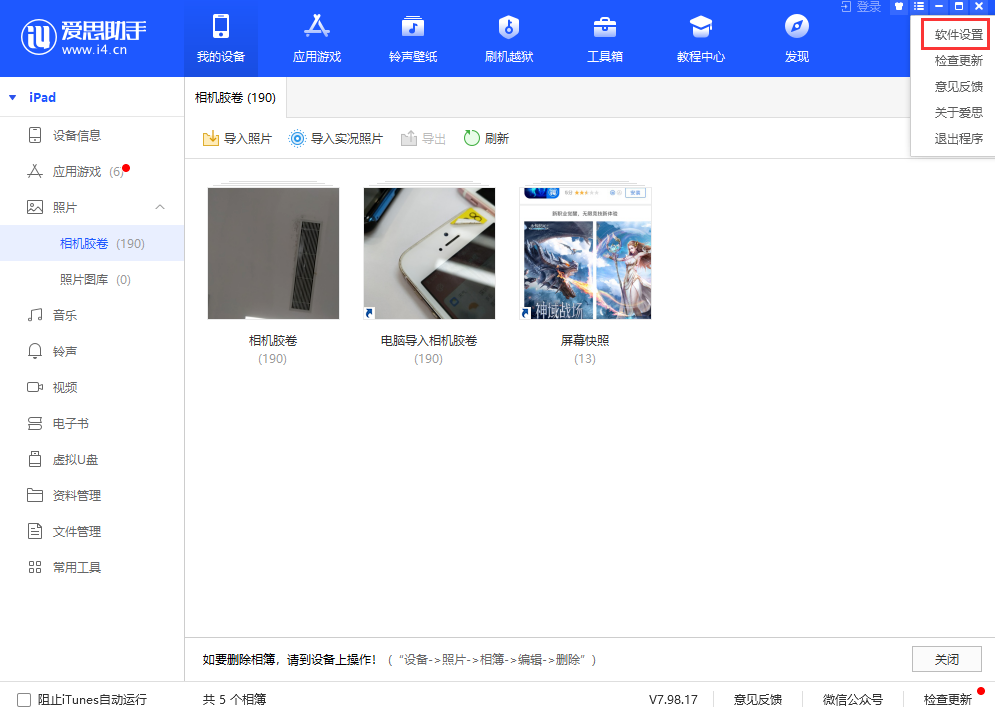 2、在爱思助手“我的设备”-“照片”界面中,可以查看到 iPhone 中储存的所有照片和视频;请点击右上角的“软件设置”,在照片管理中设置导出格式。