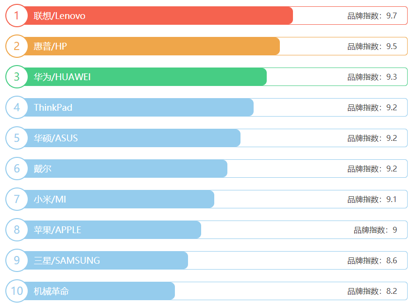 目前2021最新的口碑最好的笔记本电脑品牌排行榜如下: