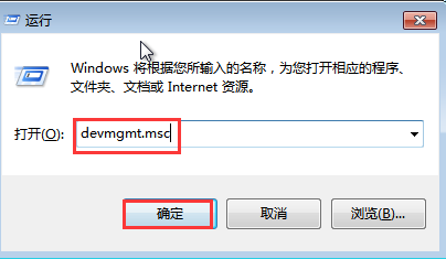 1、首先使用快捷键“Win+R”打开运行窗口,输入“devmgmt.msc”并点击“确定”,打开“设备管理器”。