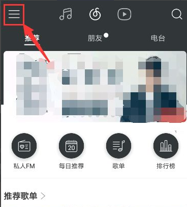 1、首先打开云音乐app,可以看到主界面左上角有一个“三”,点击打开侧边栏。