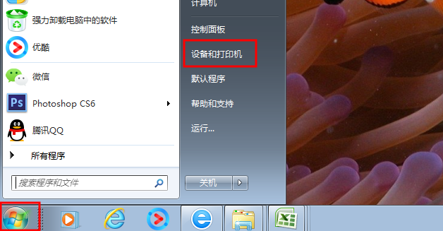 1、点击【开始】键,选择右边【设备和打印机】。