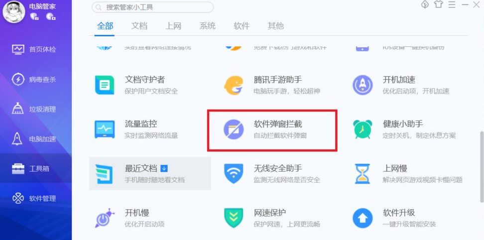 1、打开我们的电脑管家,左栏里工具箱下拉有一个“软件弹窗拦截”我们点击就会自动下载。