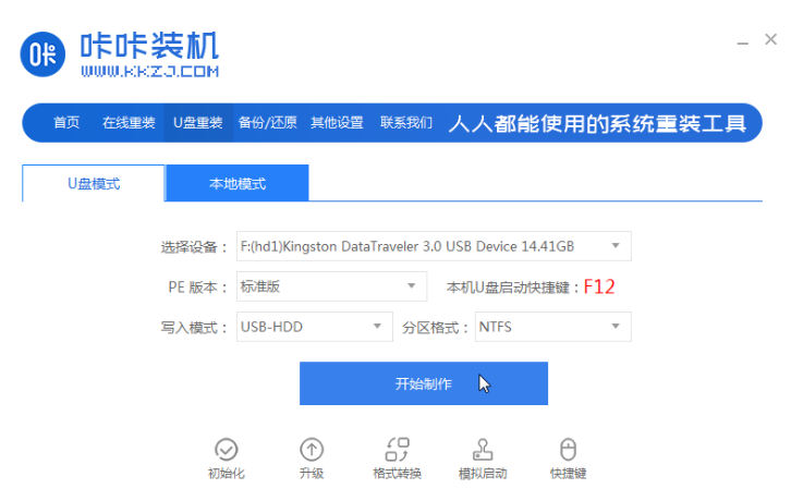 1.首先下载并安装卡卡安装机一键重装系统工具,打开,插入8g以上的空白u盘,选择u盘重装系统模式,点击开始生产。