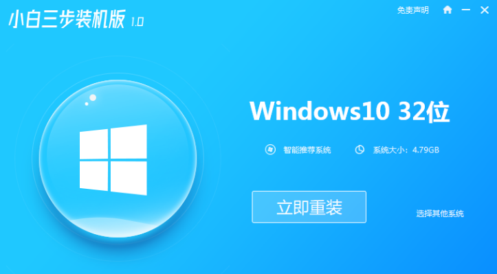1.备份个人重要信息,退出计算机安全软件。然后去小白系统官网下载小白三步装机版软件并打开。小白三步装机会推荐系统,点击立即重装。