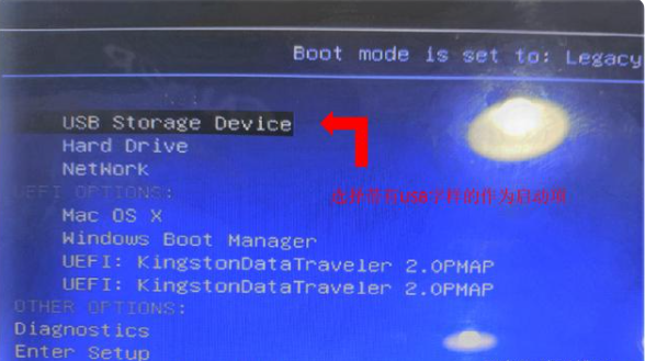 如果电脑是UEFI启动的,直接按下F2或者DEL键进入启动项设置,如下图所示,按F8选择带有USB字样的选项即可。