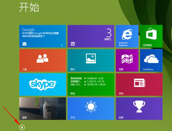 1、首先点击win8.1系统的开始菜单,然后在新的win8.1开始界面,点击开始界面左下角的箭头进入。