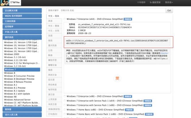 3、打开后点击“操作系统”,在这里面可以看到各种版本的操作系统,比如要下载win7就选择windows7展开,在右侧就可以找到我们所需的系统版本,点击“详细信息”,复制ed2k链接,可以使用迅雷、旋风、百度网盘离线等工具下载。