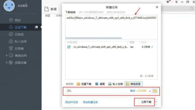 4、等复制好下载地址ed2k链接,再打开迅雷,百度网盘等工具,软件便会自动识别到下载链接,或者新建下载,粘贴地址,选择下载位置。
