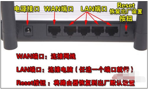 1、首先参照下图路由器的构造,用网线将无线路由器和电脑连接起来,当然也可以直接使用无线搜索连接,但是新手还是建议使用网线直接连接即可,然后启动路由器。