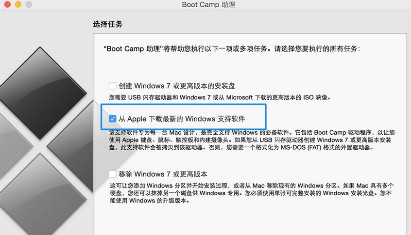 1.在Macos上运行BootCamp助理,在选择任务界面时检查从Apple下载最新Windows。支持软件”选项。这样一来,系统可以根据当前电脑的配置自动下载驱动到U盘中。另外此时请把U盘插入到Mac电脑中。