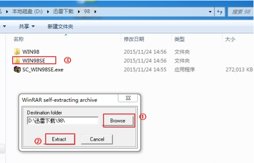 首先我们将win98系统下载到非系统盘当中,然后将其进行解压,解压后有两个 版本98 文件,任意一个即可,98 SE是98的升级版。