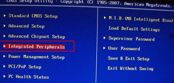 一、电脑启动,当启动画面出现时,不断按BIOS快捷键进入BIOS设置界面,选择IntegratedPeripherals并回车。(不同的电脑按键不同,可自行上百度搜索)