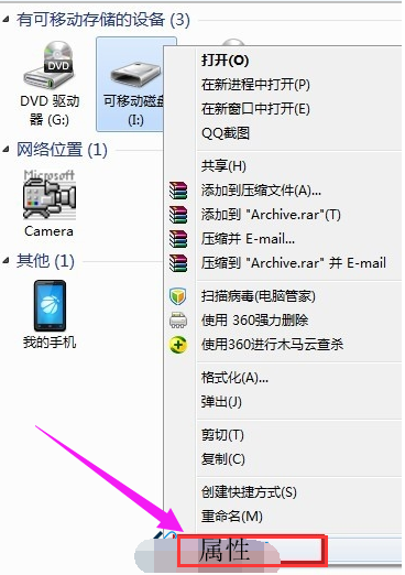1、右击“可移动磁盘”,从弹出的右键菜单中选择“属性”。