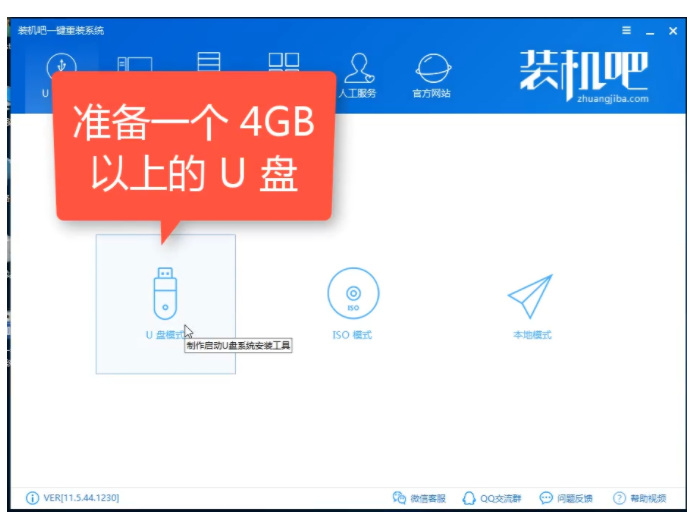 2.打开下载好的装机吧,选择顶部栏目的U盘启动,然后选择U盘模式。