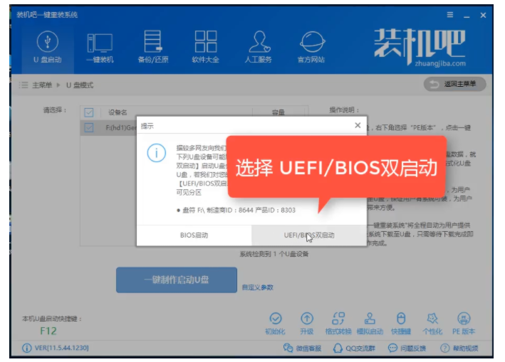 3.将准备好的U盘插入到电脑,U盘的重要资料必须备份,否则制作U盘会将U盘格式化,造成数据丢失。软件会自动识别到U盘,然后其他的默认就行了,点击一键制作启动U盘,选择UEFI/BIOS双启动模式,然后在选择高级版的PE。
