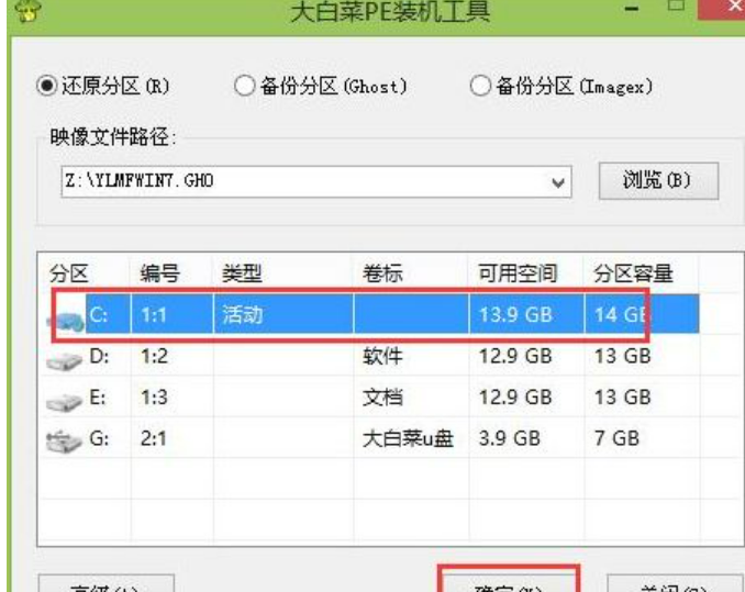 4,等待大白菜PE装机工具提取所需要的系统镜像文件后,在下边选择一个空间较大的磁盘由于安装系统使用,然后点击“确定”进入下一步。