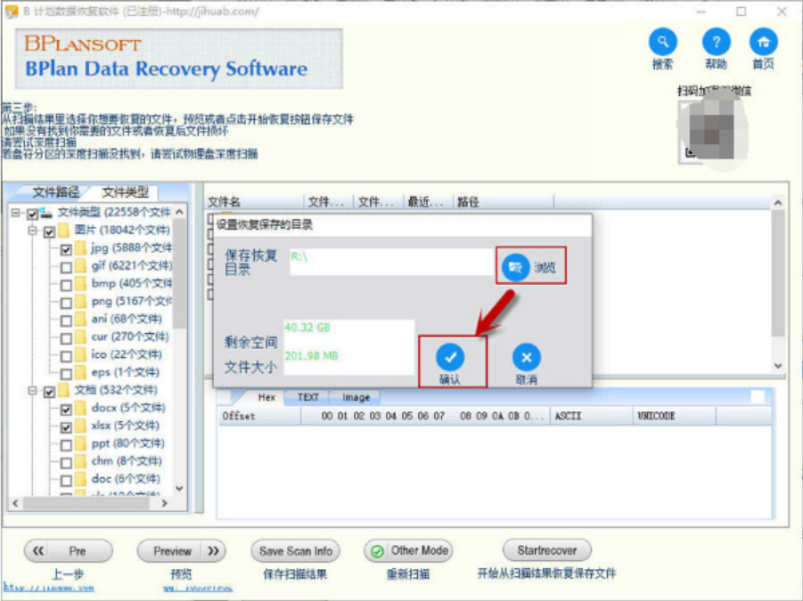 7、设置恢复保存数据地址,然后点击“确认”按钮。保存位置一定不要设置在丢失文件同一个盘符中。
