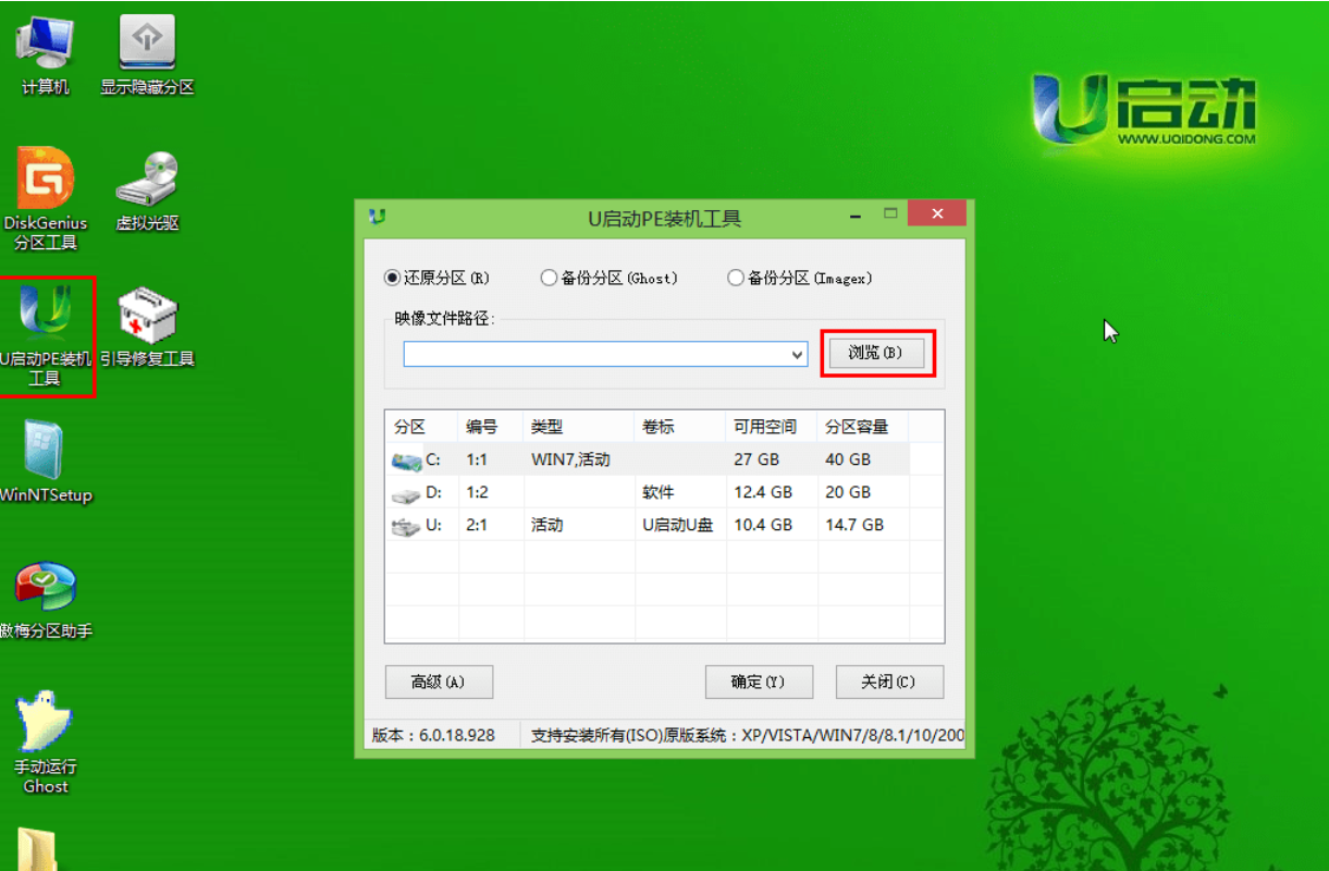 第二步:进入pe系统后,鼠标左键双击打开桌面上的u启动PE装机工具。打开工具主窗口后,点击映像文件路径后面的“浏览”按钮,如下图所示: