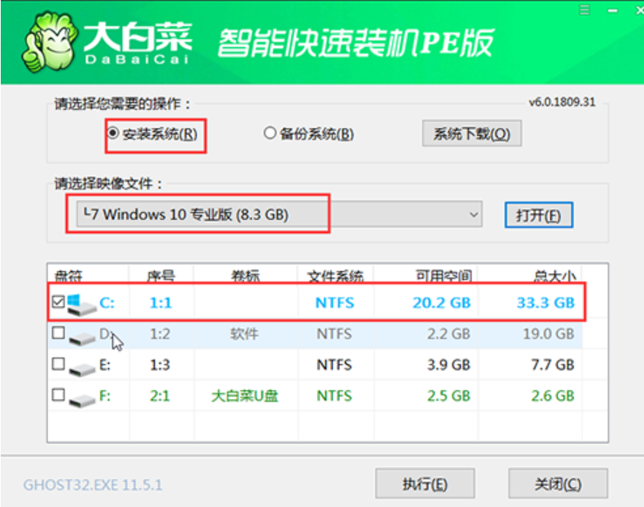 4、回车进入大白菜PE菜单,选择【启动Win10 X64 PE(2G以上内存)】,回车进入pe系统,点击【打开】选择要安装的win10系统以及安装路径,点击【执行】。