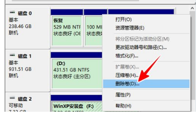 2、打开磁盘管理的窗口之后,找到你的 U 盘,在上面右击鼠标,点击“删除卷”。