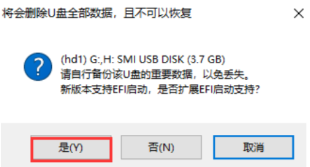 4.点击一键制作就会弹出关于“U盘数据删除且无法恢复”的窗口,选择【是】。