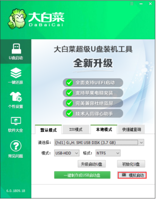1.打开大白菜超级U盘装机工具,点击主界面U盘启动模块,然后选择默认模式。