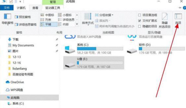 2、选中U盘设备,点击”查看“ -->”选项“ -->”更改文件夹和搜索选项”。