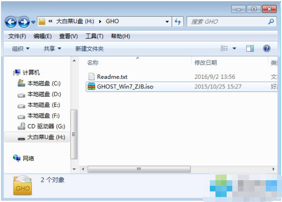 1、将win7 iso文件复制到大白菜U盘的GHO目录下;
