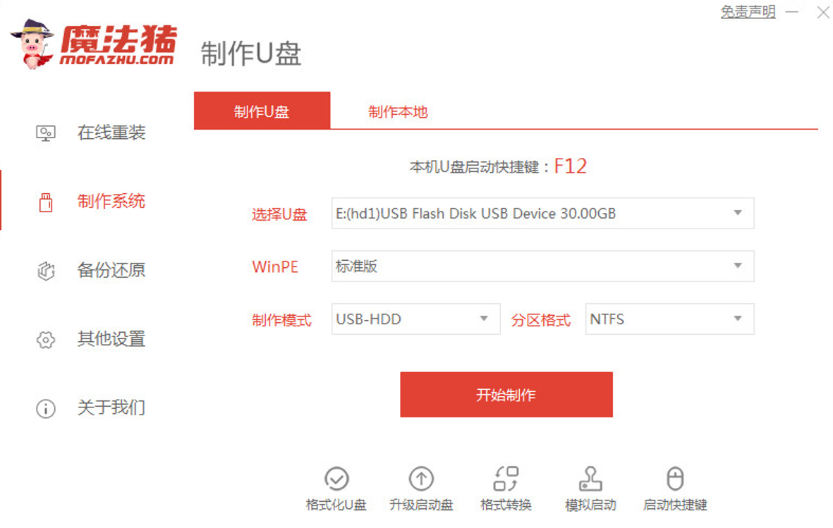 1、下载魔法猪装机工具,插入U盘,点击开始制作。