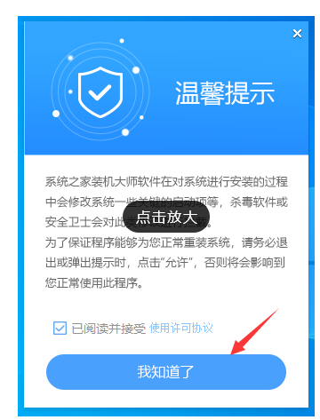 1、下载并打开系统之家装机大师软件,阅读完使用许可协议后勾选“已阅读并接受使用许可协议”,然后点击我知道了。