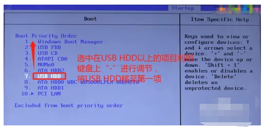 5、选中第七行“USB HDD”项以上的选项,利用键盘上的“-”键将“USB HDD”设置成第一行。