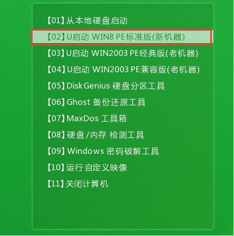 1、在电脑的usb接口上插入存有win8系统镜像的u启动u盘启动盘,重启电脑,在出现开机画面时通过u盘启动快捷键进入u启动主菜单界面,选择【02】按下回车键。