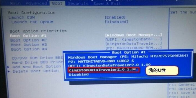 4、在选项中找到并选择u盘,然后按F10保存退出。