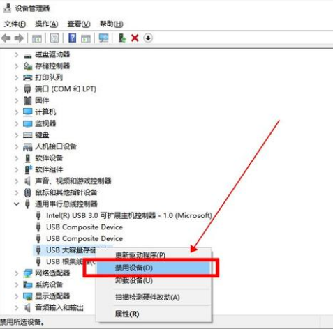 3:下拉选项中有“USB大容量存储设备”,选中并右键点击“禁用设备”即可。
