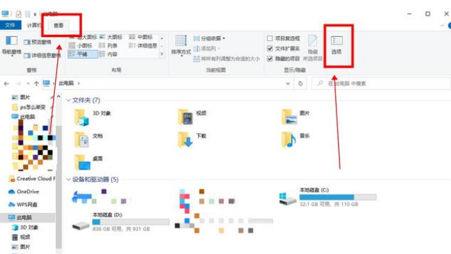 1:将U盘插入进电脑,点击进入“此电脑”,在此电脑窗口中点击“查看”下的“选项‘’。