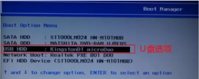 2、在启动项选择菜单界面下,选择usb项进入U盘重装页面;