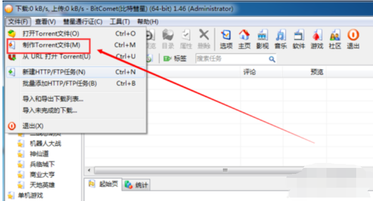 1,首先打开bitcomet,在工具栏“文件”菜单下,找到“制作torrent文件”