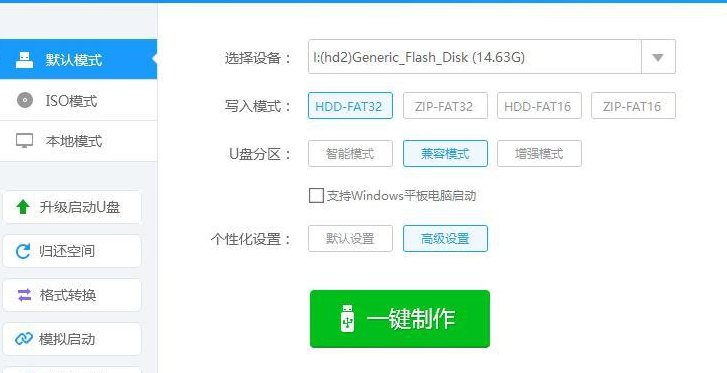 1、插入U盘,备份u盘数据,打开下载好的老毛桃,根据如图所示进行设置,然后点击一键制作