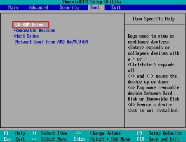 借助光盘启动盘重装系统步骤:1、首先按Del键进入BIOS,选中CDROM为第一启动项。