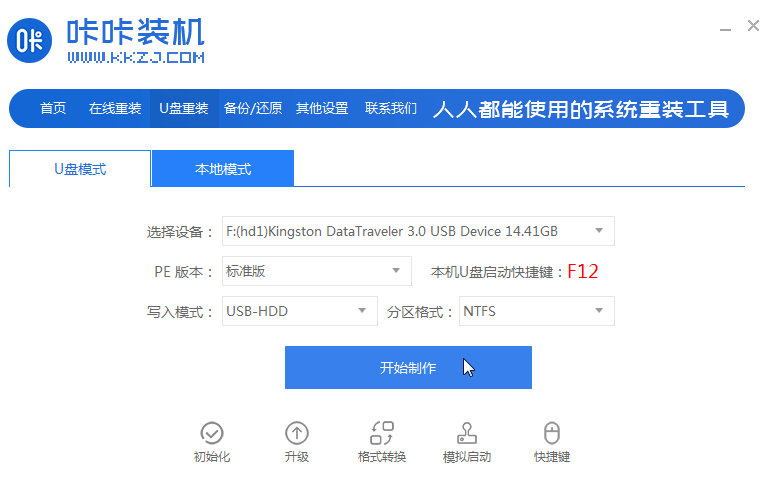1.首先下载并安装卡卡安装机一键重装系统工具,打开,插入8g以上的空白u盘,选择u盘重装系统模式,点击开始生产。