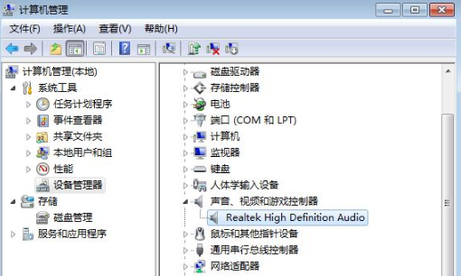 1.打开【设备管理器】页面,我们找打下方【声音,视频和游戏控制器】选项,点击【RealtekHighDefinitionAudio】查看是否正常显示,如果出现感叹号,说明驱动异常。