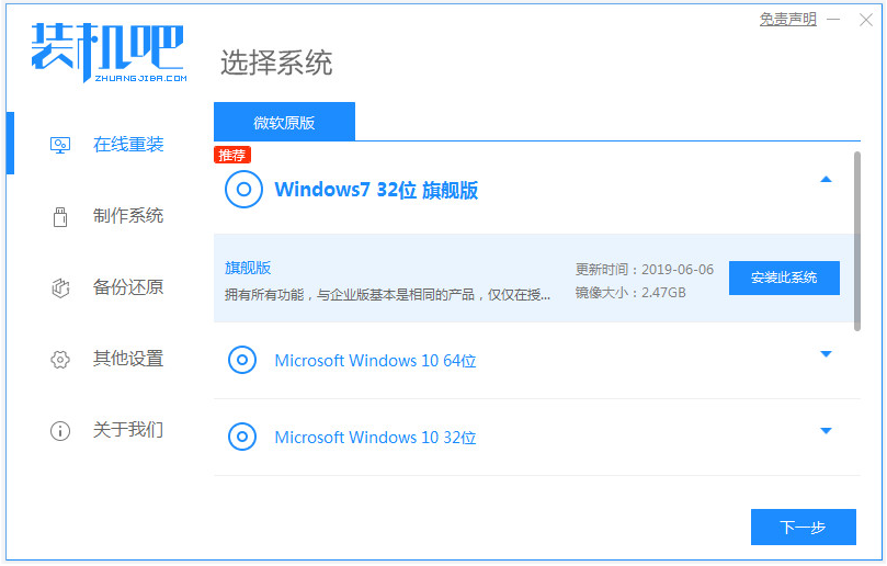1、在电脑上打开安装好的装机吧一键重装系统软件,选择需要的windows7系统点击安装此系统。