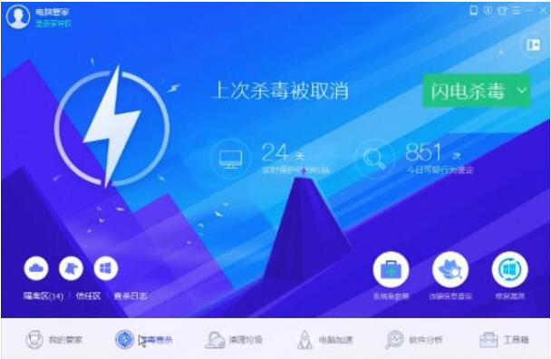 1.打开电脑管家,在打开的主页上选择底部的病毒。