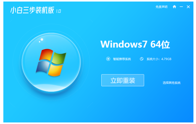 1、电脑上打开小白三步装机版软件之后选择win7系统,点击立即重装。
